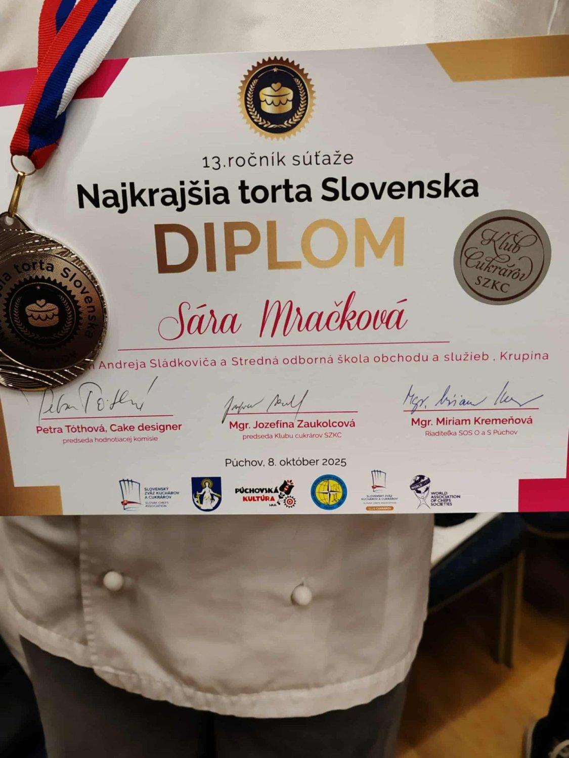 Našu školu úspešne reprezentovala žiačka 3. ročníka Sára Mračková, ktorá pripravila originálnu tortu s názvom „Sladké túžby – túžby po láske“pod odborným vedením Bc. Michala Končeka. Jej tvorivosť, precíznosť a estetické spracovanie boli ocenené strieborným pásmom.
