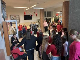 Už od rána sa chodbami niesla červená farba, keďže sme sa zapojili do výzvy „Obleč sa do červenej“. Symbolizovala energiu, radosť a zdravé srdce, na ktoré sa počas dňa kládol dôraz. Zaujímavým a poučným bodom programu bola prednáška pani Mgr. Gondášovej z Regionálneho úradu verejného zdravotníctva vo Zvolene, ktorá nám vysvetlila, ako predchádzať srdcovocievnym ochoreniam. Dozvedeli sme sa, že zdravý životný štýl nie je nič zložité, stačí viac pohybu, vyvážená strava a dostatok odpočinku. Veľkým zážitkom bolo aj vytvorenie živého srdca. Nebola to len pekná symbolika, ale aj malá pohybová aktivita všetci sme sa do tvaru srdca zoradili chôdzou. Chceli sme tak poukázať na to, že práve pohyb je dôležitou súčasťou prevencie a k zdraviu patrí rovnako ako zdravá strava.Počas dňa sme si mohli vyskúšať aj meranie na prístroji InBody či kontrolu krvného tlaku.